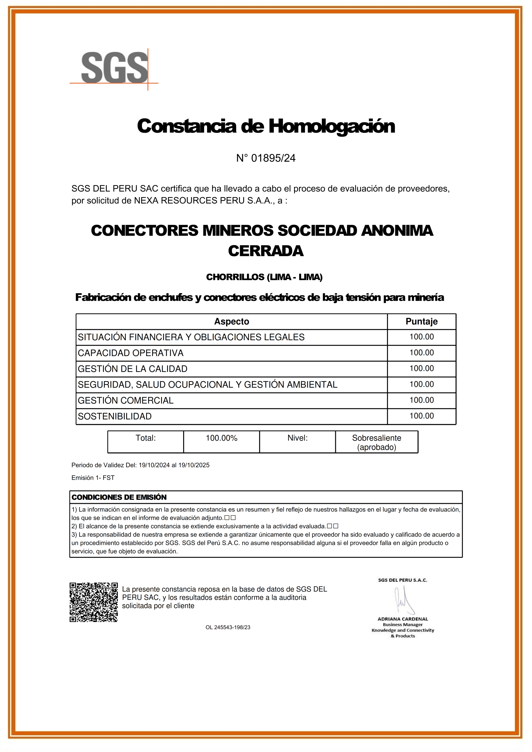 acuerdo con SGS DEL PERÚ S.A.C. para llevar a cabo el proceso de homologación. Así pues, SGS realiza la evaluación de manera eficiente e imparcial, desde la recepción de la documentación hasta la entrega de los resultados de la auditoría a la Minera.